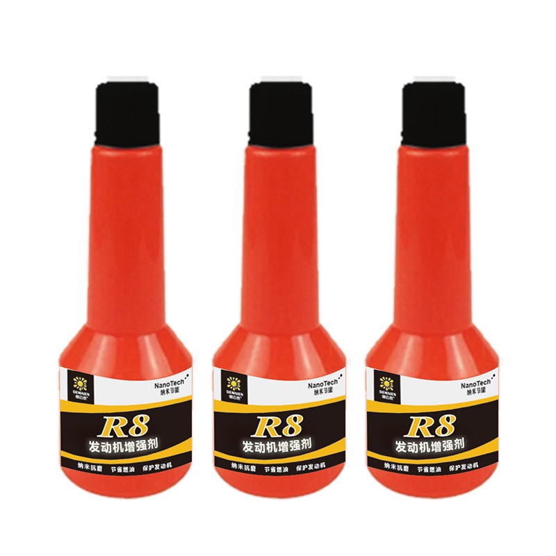 产品简介: R8发动机增强剂采用纳米铜抗磨技术研制而成,可溶于润滑油中,不会破坏润滑油各项指标的平衡。 本品可在摩擦副表面形成均匀层状结构,减少横向剪切阻力,强力抗摩擦,降低机械做功消耗,有效节省燃油5%-8%。使用方法:直接加入发动机或混合汽机油、柴机油或齿轮油中使用,推荐加入比例1%-2%。包装规格:100ml*30瓶/箱